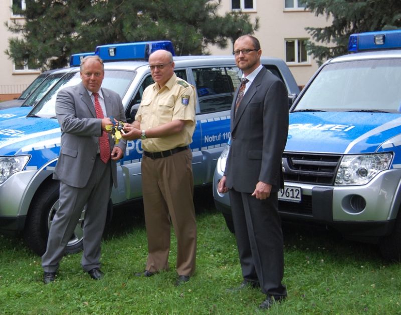 Archiv | August 200707.08.2007 Mitsubishi übergibt Pajero Geländewagen an die hessische Polizei - Die ersten fünf von insgesamt rund 40 Fahrzeugen wurden ausgeliefert Der Geschäftsführer der Mitsubishi Motors Deutschland GmbH, Thomas Kursch, hat heute in der hessischen Landeshauptstadt Wiesbaden fünf Pajero Geländewagen an den Leiter Zentrale Dienste des Polizeipräsidiums für Technik, Logistik und Verwaltung (PTLV), POR Peter Gomoletz, übergeben. Die Pajero Offroader wurden vom Wiesbadener Mitsubishi
