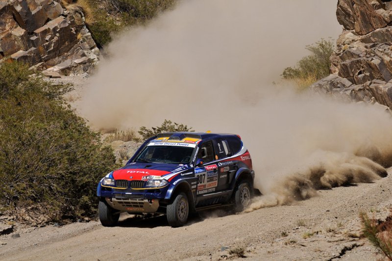 Rallye Dakar 2010, Etappe 11 – Aufstand der Hinterbänkler13.01.2010 Der Franzose Guerlain Chicherit und seine Copilotin Tina Thörner im X-Raid BMW holen sich auf der 11. Etappe ihren ersten Tagesssieg bei der diesjährigen Dakar, mit knappem Vorsprung auf den Lokalmatador OrlandoTerranova im Mitsubishi und das südafrikanisch-deutsche Duo de Villiers/ von Zitzewitz (VW). Beim Abstieg aus den Anden von rund 3.000 Höhenmetern hinunter nach Argentinien musste der in der Gesamtwertung weiter führende Spanier Carlos Sainz (VW) einen Rückschlag hinnehmen: Zwei schleichende Plattfüße warfen ihn zurück auf Platz neun der Tageswertung. Im Gesamtklassement hat er nun nur noch 4:28 Minuten Vorsprung vor seinem Teamkollegen Al-Attiyah aus Katar. Mit 23:50 Minuten Abstand bleibt Mark Miller (ebenfalls VW) dritter. Das auf dem fünften Platz des Gesamtklassements liegende X-Raid BMW Team Guerlain Chicherit und Tina Thörner kamen mit der Tagesbestzeit in San Juan in Argentinien an. Das französisch-schwedische Duo begann die Etappe als Fünfte und konnte das Tagesziel 30 Sekunden vor dem Lokalmatador Orlando Terranova im Mitsubishi Race Lancer beenden. Das ist der erste Etappensieg für die beiden bei der diesjährigen Dakar und Chicherits zweiter insgesamt.