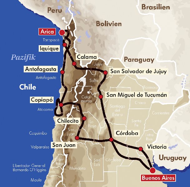 Datum Start Ziel 01. 01. Buenos Aires Victoria 02. 01. Victoria Córdoba 03. 01. Córdoba San Miguel de Tucumán 04. 01. San Miguel de Tucumán San Salvador de Jujuy 05. 01. San Salvador de Jujuy Calama 06. 01. Calama Iquique 07. 01. Iquique Arica 08. 01. Ruhetag 09. 01. Arica Antofagasta 10. 01. Antofagasta Copiapo 11. 01. Copiapo Copiapo 12. 01. Copiapo Chilecito 13. 01. Chilecito San Juan 14. 01. San Juan Córdoba 15. 01. Córdoba Buenos Aires 16. 01. Zieleinfahrt