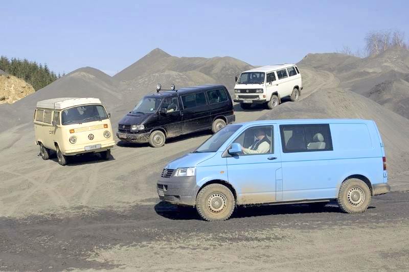 Foto zeigt den schwarzen T4 zwischen T2 (links) und T3 (rechts) - vorn die neueste Generation T5 4MOTION