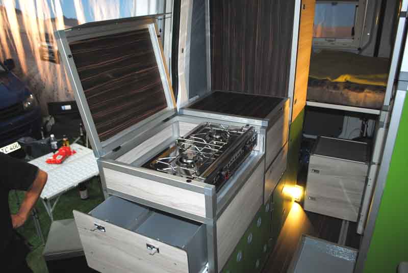 Caravan Salon Düsseldorf 2012 Nachlese: Highlights aus der Allrad- und Outdoor-Ecke / Seite 2Für Freunde geländegängige Camper der Gattung Kastenwagen ist der Name „Terra Camper“ ein Begriff: Martin Hemp hat das bekannte modulare Möbelkonzept für seinen VW T5 „Terock“ (Basis: Rockton), den er im vergangenen Jahr vorgestellt hatte (siehe unserer Meldung), nun für den VW Crafter 4x4 mit dem Achleitner-Allradantrieb adaptiert. In dem „Tecraft“ genannten Modell kommen nun also ebenfalls die bewährten, robusten Aluminium-Module für Kühlbox, Kocher, Spülbecken, Sanitärraum und Stauschränke sowie das „Easy-Use-System“ mit Schienen plus Halterungen im Dachbereich zum Einsatz. Der „Tecraft“-Prototyp wurde just vor dem Caravan-Salon fertig, Preis und mögliche Lieferzeiten sind damit noch in der Pipeline.