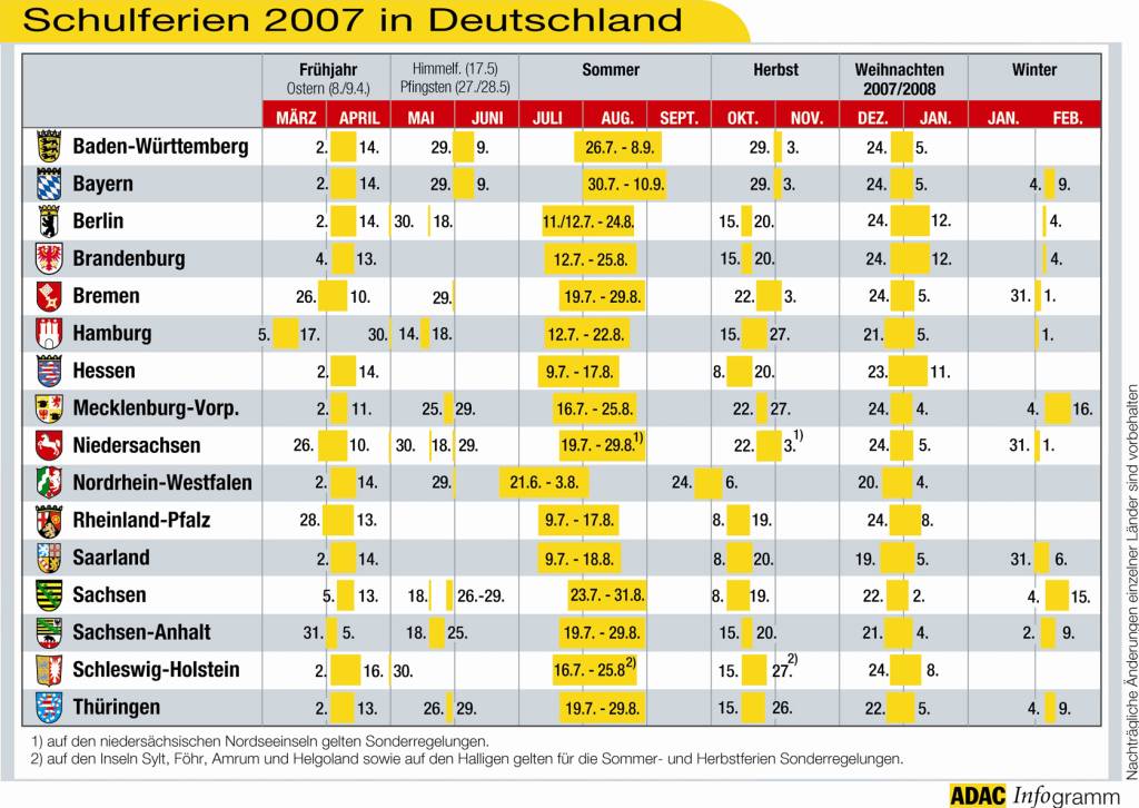Ferientermine in Deutschland - Der ADAC erwartet die dicksten Staus im Juli und August14.03.2007 Wenn deutsche Schüler jubeln, stöhnen die Autofahrer. Vor allem die Sommerferienzeit sorgt auf Deutschlands Autobahnen häufig für lange Staus. Besonders die vier Samstage im Juli, aber auch das erste Augustwochenende, sind besonders staugefährdet. Wer unnötige Verzögerungen vermeiden möchte, sollte laut ADAC unbedingt während der Woche starten und gegebenenfalls eine Übernachtung auf dem Weg ins Urlaubsziel einplanen. Die ADAC-Übersicht zu den Ferienterminen 2007 in Deutschland hilft bei der frühzeitigen Planung. Die schulfreie Sommerzeit beginnt in Nordrhein-Westfalen. Im bevölkerungsreichsten Bundesland schließen die Schulen bereits am 21. Juni. Ab 9. Juli freuen sich die Schüler in Hessen, Rheinland-Pfalz und dem Saarland über die sechswöchige Pause. Es folgen am 12. Juli Berlin, Brandenburg und Hamburg. Tipps rund ums Hobby