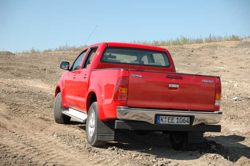 Schrot und Korn - Toyota Hilux 2.5 D4-D Double Cab Sol - Seite 5Dabei werden es nicht die langen Autobahnetappen sein, die die Hilux-Crew favorisiert, dafür ist die Blattfederung der hinteren Starrachse einfach zu sehr auf Lastverkraftung ausgelegt, das heißt: bei nur leichter Füllung der Laderfläche gibt sie Bodenwellen und Betonplattenübergänge recht kernig an die Wirbelsäulen weiter. Auf Landstraßen und mit gemäßigten Tempo lässt sich diese Raubeinigkeit verdauen. Beim Geländeausflug begeistert sie uns dann mit und nach alter Väter Sitte: Hier zeigt der Hilux in seiner ganzen Konventionalität mit besagtem Leiterrahmen und Starrhinterachse sowie zuschaltbarem Allrad mit kurzer Untersetzung (Reduktion: 2,56:1) und einer Bodenfreiheit von 20 Zentimetern, wie gut er über Erderhebungen turnen und Steilhänge hinauf- und hinabklettern kann.