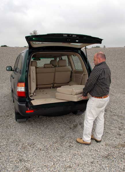 Im Clubsessel durchs Gelände - Toyota LandCruiser J100 4.2 TD Executive - Seite 5Braucht man diese nicht – und das ist sicherlich der Regelfall – ruhen sie nach einigen Handgriffen seitlich hochgeklappt an der Bordwand. Mit etwas Kraft- und Logistikaufwand lassen sie sich auch komplett ausbauen... Damit eröffnet sich ein langer, großzügiger und ebener Laderaum: Knapp 1,60 m von der Wand der nach unten öffnenden Heckklappe (das Fenster schwingt nach oben) bis zur vorgeklappten Fondbank.. Das Ärgernis der zweigeteilten Heckklappe: Von dort ist Transportgut, das nach einer Bremsung in den tiefen Laderaum gerutscht ist, nicht ohne Verrenkungen zu erreichen. Auch wenn die Ladekante mit 76 cm in der untersten Fahrwerksstufe schon mal angenehm niedrig für einen großen Geländewagen ist. Man muss dann eben über die Fondtüren ran (hoffentlich nicht in einer engen Parklücke!).