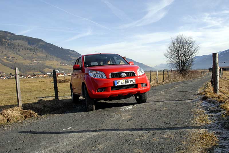Kompaktes SUV für wenig Geld - Daihatsu Terios - Seite 4In seinem Element ist der Terios aber, sobald es runter von den geteerten Straßen geht – für den Offroad-Einsatz haben die Japaner ihr SUV schließlich gut gerüstet. Die Motorkraft wird bei allen Terios-Versionen über ein zentrales Differenzial permanent und zu gleichen Teilen an die beiden Achsen geleitet. Über einen Knopf links am Armaturenbrett lässt sich das Zentraldifferenzial zu 100 Prozent sperren. Für ein weiteres Traktions-Plus sorgt die elektronische Schlupfregelung des Stabilitätsprogramms, die sich bei Bedarf auch abschalten lässt. Mit einer vorderen Einzelradaufhängung und schraubengefederter hinterer Starrachse setzten die Japaner auf eine robuste Konstruktion, die eher Geländewagentechnik als SUV-Standard ist. Dank der kurzen Übersetzung meistert der Terios auch noch relativ steile Passagen – trotz fehlender Geländereduktion. Und die kurzen Überhänge sowie die Bodenfreiheit von 20 cm sichern ihm geländetaugliche Böschungs- und Rampenwinkel. Der Terios ist so ein idealer Begleiter, wenn Hobby oder Beruf Abstecher ins leichte Gelände erfordern. Daihatsu