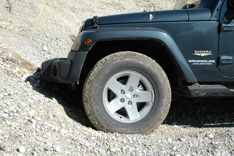 Jeep Wrangler 3.8 Automatik Unlimited Sahara – Bergziege für fünf Alpinisten - Seite 3Entsprechend souverän meistert der Unlimited Geländeausflüge jeder Art. Mit seiner Bodenfreiheit von einem Viertelmeter und entsprechend guten Böschungs- sowie Rampenwinkeln nimmt er auch grobe Geländeverwerfungen ohne aufzusetzen, und die beiden Starrachsen halten immer noch Bodenkontakt – ungeteilte Achsen verschränken nun mal besser als die meisten Einzelradaufhängungen, selbst wenn diese noch so aufwändig konstruiert sind. Mit 199 PS (146 kW), einer vernünftig kurzen Geländereduktion (2,72:1) und der Drehmomentverstärkung im Wandler des Automatikgetriebes scheut der Wrangler keinen Anstieg. Beim langsamen Rollen im Standgas genügt ein kleiner Impuls vom Gaspedal und der Wrangler stellt verzögerungsfrei Leistung im Überfluss bereit. So macht das Kraxeln und Klettern einfach nur Spaß! Und selbst ein Stopp mitten in der Steigung verursacht keine Schweißperlen auf der Stirn des Fahrers: Die Berganfahrhilfe „BAS“ hält den Wrangler sicher am Hang, und ein einfacher Tritt aufs Gaspedal genügt, um die Fahrt wieder fortzusetzen – sofern die Traktion dann noch ausreicht, ansonsten hilft die Traktionskontrolle per Bremseneingriff relativ effizient weiter.