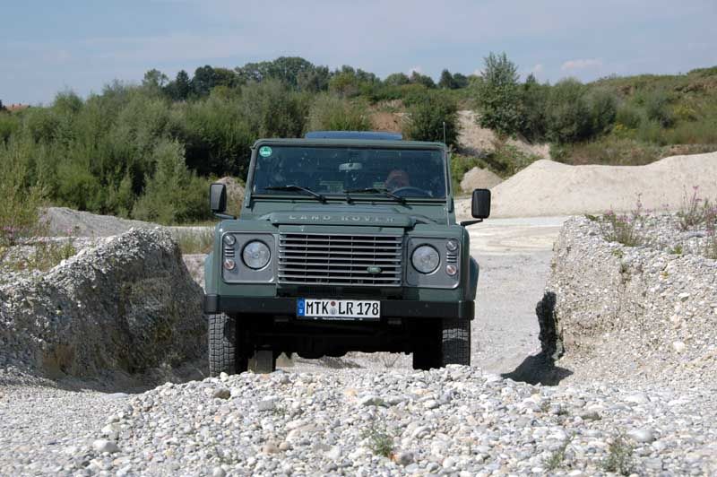 Land Rover Defender 90 Station Wagon - Ganz der Alte und doch viel besser - Seite 5Ein Drehmomentbulle unter der Haube, dahinter ein Getriebe mit kurz übersetztem ersten Gang und dazu noch eine Reduktion, deren Untersetzung mit 1:2,7 deutlich Kraft steigernd und Tempo senkend ausfällt – diese Antriebseinheit gefällt im Offroad-Betrieb. Mit stoischer Gelassenheit wühlt sich der Defender in Schrittgeschwindigkeit durch dick und dünn, um bergab mit gleich geringer Geschwindigkeit zu kraxeln. Die kurzen Überhänge und die große Bodenfreiheit zwischen den Achsen sorgen für erstklassige Geländewinkel, die auch groben Kuppen ihre Schrecken nehmen. Und da im Defender immer noch ein „echter“ Permanent-Allrad mit manuell sperrbarem Zentraldifferenzial zum Einsatz kommt, treten auch in schwerem Gelände keine Traktionsprobleme auf: Wo der Defender nicht hinkommt, dort presst auch kein anderer Serien-Offroader seine Reifenspuren in den Boden – das war schon immer so und daran hat sich bis heute nichts geändert.