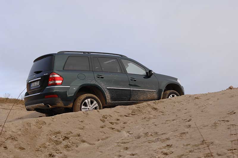 GL - wie Gaaanz Lang - Mercedes GL 320 CDI - Seite 4Serienmäßig werden die 224 PS des Dreiliter-V6-Zylinders über ein siebenstufiges Automatikgetriebe an die vier permanent angetriebenen Räder weitergeleitet. Und diese Motor-Getriebe-Einheit arbeitet im positivsten Wortsinn unauffällig. Trotz seiner 510 Newtonmeter Drehmoment fehlt dem Basismotor in der GL-Reihe der brachiale Antritt großvolumiger V8-Dieseltriebwerke - und trotzdem hat man stets das gute Gefühl, sehr angemessen motorisiert zu sein: Die Arbeitsgeräusche halten sich stets dezent im Hintergrund, Vibrationen kennt der Sechszylinder nicht, und dank serienmäßigem Partikelfilter und Euro-4-Einstufung ist auch das Umweltgewissen beruhigt. Zum positiven Eindruck der Antriebskombination trägt auch die 7G-TRONIC bei, die spontan auf Gaspedalimpulse reagiert, dabei aber nicht die Contenance verliert und die Gangwechsel weich vollzieht. Gleichzeitig kann der Fahrer über Schalter am Lenkrad die Gangwahl manuell beeinflussen. Dass Motor und Getriebe gelungen aufeinander abgestimmt sind, belegen die Fahrleistungen (siehe Technik-Tabelle) ebenso wie der moderate Testverbrauch von knapp elf Liter auf 100 Kilometer.