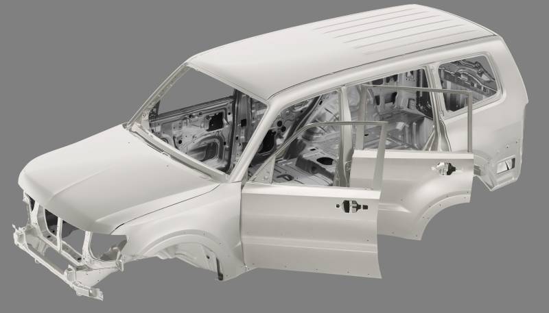 Der neue Mitsubishi Pajero - wertvoller und schwerer - Seite 2Die neue vierte Generation lehnt sich mit der selbsttragenden Monocoque-Karosserie und Einzelradaufhängung stark an das Vorgängermodell an, doch wurden über 70 Prozent der Fahrzeugteile neu entwickelt und dabei der Anteil an verzinkten Blechteilen zum Korrosionsschutz verdoppelt. Die Fahrgastzelle bildet mit ihrem Verstärkungsrahmen eine steife Sicherheitszelle, wobei zusätzliche Schweißpunkte für einen deutlichen Zuwachs in der Torsions- und Biegesteifigkeit sorgen sollen. Einen Hauptbeitrag zum besseren Geräuschkomfort des neuen Pajero leisten neben den genannten Versteifungsmaßnahmen an der Karosserie leiser laufende Motoren. Dazu kommen Geräusch dämmende Beschichtungen an Motorhaube, Fahrzeugdach und Fahrzeugboden, ein größerer hinterer Querträger sowie die dickere Frontscheibe (5,3 anstatt 5,0 mm). Eine um fünfzig Prozent leichtere und nur noch neun Kilogramm schwere Aluminium-Motorhaube trägt zusätzlich dazu bei, dass die Gewichtszunahme der vierten Pajero-Generation moderat (zirka + 60 kg beim Fünftürer) und die Gewichtsverteilung insgesamt etwas günstiger ausfallen. Video 347 KB