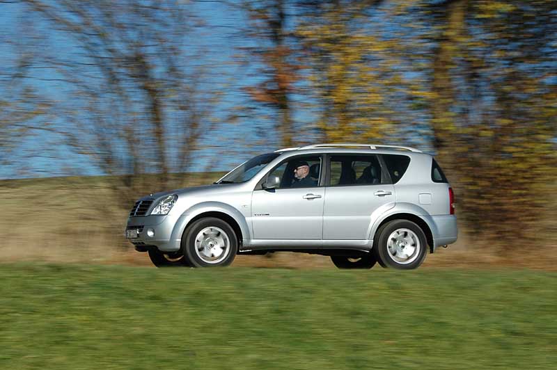 Kerniger Softie für Sieben - SsangYong Rexton 270 Xdi s Automatik - Seite 404.12.2006 Im Normalfall treibt die Motor-Getriebe-Einheit beim Rexton nur die Hinterräder an, die Vorderachse sowie die Geländeuntersetzung werden per Drehschalter links am Armaturenbrett zugeschaltet. Speziell bei Nässe kommt der konventionelle Heckantrieb schnell an seine Grenzen: Bei vollem Leistungseinsatz in Kurven drehen die Hinterräder durch, was die sensibel arbeitende Traktionskontrolle des ESP immer wieder zum Eingreifen veranlasst – kein Wunder, wenn 345 Newtonmeter auf den Wandler im Automatikgetriebe losgelassen werden. Entsprechend zügig kann man mit dem Rexton unterwegs sein. Gerade in dem beim Überholen so wichtigen Geschwindigkeitsbereich zwischen 80 und 120 km/h gibt sich der SsangYong richtig sportlich und absolviert diesen Sprint in knapp zehn Sekunden. Flotte Autobahnetappen ermöglicht die Höchstgeschwindigkeit von 176 Stundenkilometer und für große Reichweiten zwischen den Tankstopps sorgt das 78 Liter fassende Treibstoffreservoir in Verbindung mit dem moderaten Verbrauch von durchschnittlich 10,6 Liter pro 100 Kilometer über die gesamte Testdistanz.
