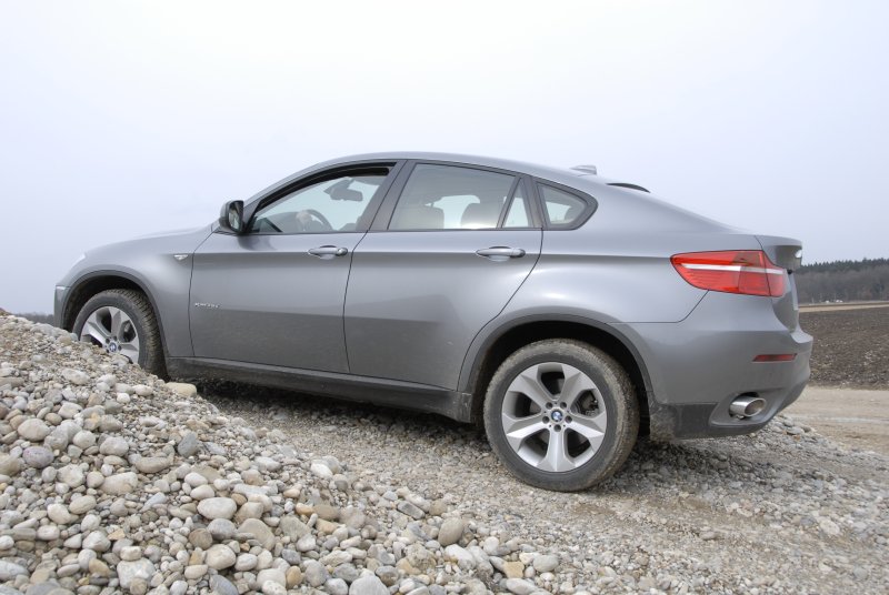 BMW X6 xDrive 35d – Familien-Coupé und High-Tech Showcar / Seite 4Also versuch ich's von der anderen Seite: Ein Coupé muss ja in erster Linie gar nicht unbedingt praktisch sein, sondern Spaß machen! Und bei dem Gewicht und der Größe – kann da so was wie Fahrspaß überhaupt aufkommen? Unter der Haube des Testwagens mit der Typbezeichnung X6 xDrive 35d ist der stärkere der beiden lieferbaren Diesel montiert: Drei Liter Hubraum von zwei Turbos künstlich beatmet, macht 286 PS (210 kW) bei 4.400 Touren und 580 Newtonmeter zwischen 1.750 und 2.250 U/min. Oder in Fahrleistungwerten gesagt: In sieben Sekunden beschleunigt der Sechszylinder den X6 auf Tempo hundert und lässt ihn in der Spitze knapp 240 Stundenkilometer schnell rennen. Die Kraftübertragung erfolgt serienmäßig per Sechs-Stufen-Automatik mit manueller Schaltmöglichkeit. Die elektronische Abstimmung der Automatik lässt den drehmomentstarken Diesel im Bummelbetrieb mit niedrigen Drehzahlen dahinbrummeln, reagiert aber spontan auf jeden Gasstoß. Das Ergebnis: man fühlt sich jederzeit üppig motorisiert, ohne dass Reue an der Tankstelle aufkommt: Im Testdurchschnitt genehmigte sich der X6 35d Familienbudget-freundliche 10,6 Liter Diesel, das ist ein Wort. Die Drehmomentverteilung auf die vier Räder erfolgt im X6 über den elektronisch geregelten xDrive Allradantrieb, der aus dem X5 wohlbekannt ist. Dennoch hat BMW das Allradsystem im X6 um eine Komponente erweitert: Die „Dynamic Performance Control“ (DPC). Während der xDrive die Antriebskräfte zwischen Vorder- und Hinterachse verteilt, übernimmt die Dynamic Performance Control die gleiche Aufgabe zwischen den beiden Hinterrädern. Sie versorgt also das Rad mit der besseren Bodenhaftung mit mehr Drehmoment, was einerseits das Handling und die Stabilität in schnell gefahrenen Kurven verbessert, andererseits die Traktion auf unterschiedlich griffigem Untergrund erhöht.