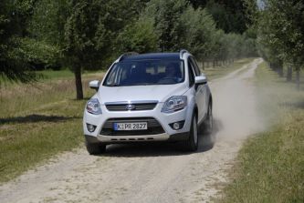 Der Kuga 2.5T verfügt serienmäßig über einen Permanent-Allrad ohne Geländeuntersetzung, dessen elektronisch gesteuerte Haldexkupplung bereits beim Anfahren zehn Prozent der Motorkraft an die Hinterräder leitet. Im Bedarfsfall steigert sie deren Anteil an der variablen Kraftverteilung auf bis zu 50 Prozent, so dass beide Achsen zu gleichen Teilen am Vortrieb beteiligt werden. Auf besondere Gelände-Features verzichtet das Antriebssystem des Kuga jedoch weitgehend. Zwar reagiert sein Allradantrieb flexibel auf verschiedene Untergründe und verhindert so ein Durchdrehen der Räder auf Asphalt konsequent, während er zur Traktionsverbesserung auf sandigen oder matschigen Strecken mehr Rad-Schlupf zulässt. Auf weitere Offroad-Features verzichtet der Kölner jedoch: Einen Bergan- oder Bergabfahrassistenten sucht man bei ihm ebenso vergebens wie eine manuelle Eingriffsmöglichkeit auf das Antriebssystem – allein das ESP lässt sich per Knopfdruck deaktivieren.