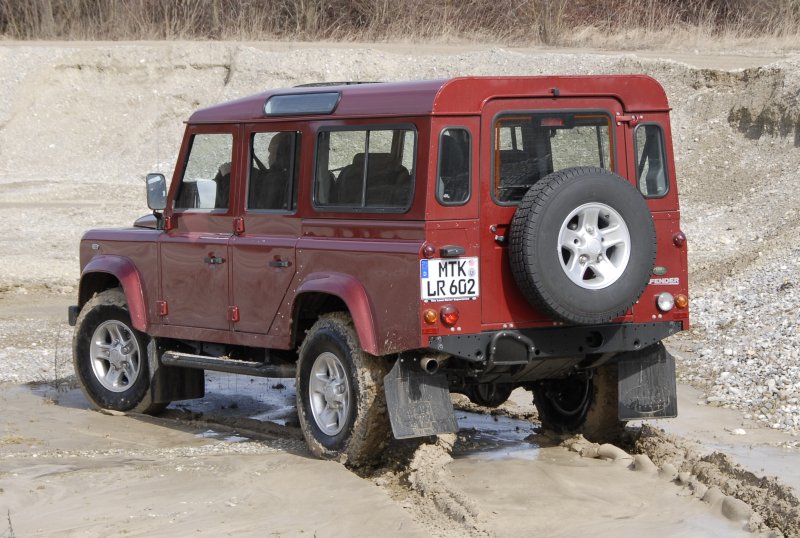 Land Rover Defender 110 TD4 Station Wagon – Oldie but Goodie / Seite 3Mit reichlich Tempo 130 – da bremst die Elektronik den Defender sanft ein – und einer moderaten Drehzahl von rund 2.800 Touren lassen sich auch lange Autobahnabschnitte stressfrei absolvieren. Dauer-Vollgas ist also kein Problem, schließlich liegt die Nennleistung von 122 PS/90 kW erst 700 Kurbelwellenumdrehungen später an: Das weit gespreizte Sechsgang-Schaltgetriebe sorgt somit für ein Motor schonendes Drehzahlniveau einerseits und für moderate Verbrauchswerte andererseits: Selbst bei Vollgasfahrt auf der Autobahn schluckte der Defender 110 im Test gerade mal 12,4 Liter Diesel auf 100 Kilometer, im gemischten Betrieb war es knapp ein Liter weniger. Dass der Straßenbetrieb eher zu den Pflichtübungen des Defender 110 gehört, teilt er seinen Passagieren unaufgeregt aber deutlich mit. Ein Geräuschniveau von 77 Dezibel bei Höchstgeschwindigkeit ist nicht gerade leise, das Fahrwerk macht keinen Hehl daraus, dass unter dem Defender zwei schwere Starrachsen stets in Bewegung sind, und wer mal voll in die Eisen muss spürt schnell, dass eine bewegte Masse von bis zu 3.050 Kilogramm (maximal zulässiges Gesamtgewicht des 110) mächtig schieben kann.