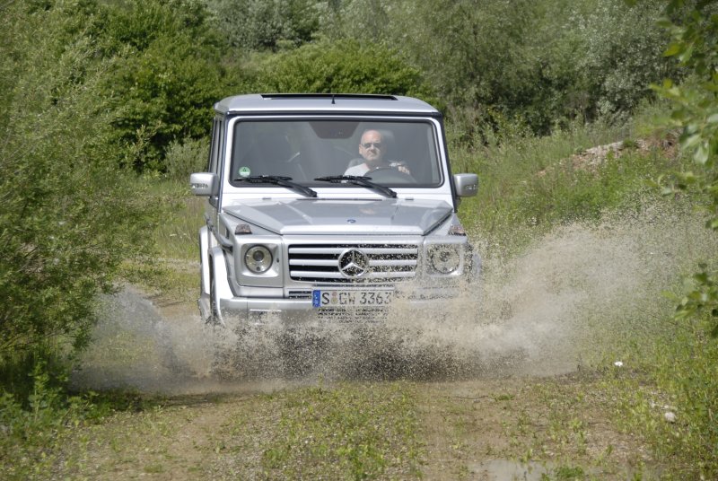 Längst vorbei sind also die Zeiten, in denen der Mercedes G auf die rechte Autobahnspur verbannt war. Ganz im Gegenteil: „Bergab mit Rückenwind“ kratzt die Nadel des Tachos schon mal an der 195-Stundenkilometer-Marke. Und wenn der knapp zwei Meter hohe G mit diesem Tempo im Rückspiegel auftaucht, dann macht er Eindruck und hat ein bemerkenswert hohes Überholprestige – das seinem Fahrer ein breites Grinsen ins Gesicht zaubert.