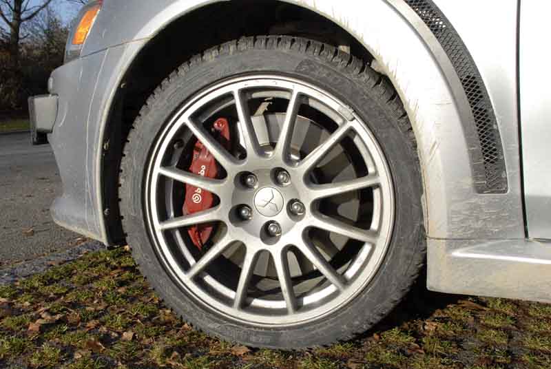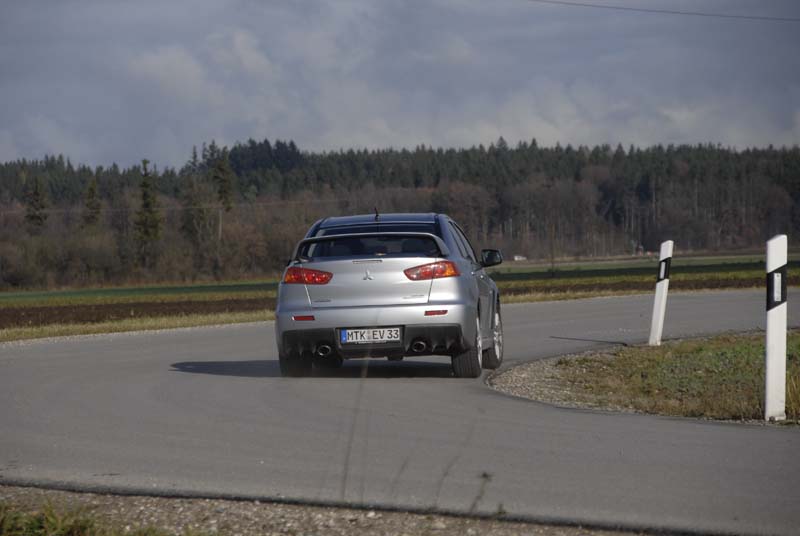 Mitsubishi Lancer Evo – Lass die Gerade Kurve sein! - Seite 3Schnell in den dritten runterschalten und den rechten Fuß abwinkeln: Push the pedal to the metal – und die 1.180 Hufe (lassen Sie den Taschenrechner stecken: es sind 295 PS) krallen sich via des elektronisch geregelten Mittendifferenzials traktionsoptimal über die vier Gummipneus in den Asphalt. Jetzt heißt es, ein Auge dem Straßenverlauf und das andere dem Drehzahlmesser zu widmen. Dann bei 7.000 Umdrehungen den vierten Gang reinhauen und schnell wieder die Hand ans gut konturierte Lenkrad, um die Nase mit der präzisen Lenkung nachdrücklich durch die nächste Biegung zu zirkeln und dabei genau den Scheitelpunkt zu treffen. Hoppla, sagt das kernig-sportlich-straff abgestimmte Fahrwerk: Da hat das Straßenbauamt aber gesündigt! Die Asphaltnarbe war deutlich, brachte den Evo aber nur für einen Wimpernschlag und nicht wirklich beängstigend aus der anvisierten Linie. Enge Kurve voraus, melden die Augen. Der rechte Fuß steppt vor dem ersten Lenkeinschlag auf das mittlere Pedal und die Zangen der Brembo-Bremsanlage packen feste zu, sorgen für eine beeindruckende Verzögerung der knapp über 1,5 Tonnen Leergewicht. Jetzt wünsche ich mir dann doch mal die Evo-Variante mit dem agilen Sechsgang-Doppelkupplungs-Getriebe inklusive der Schaltpads am Lenkrad. Damit flutschen die Zahnradpaarungen erstens einfach zügiger ineinander und zweitens sind selbige noch etwas beschleunigungsintensiver gespreizt.