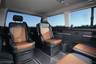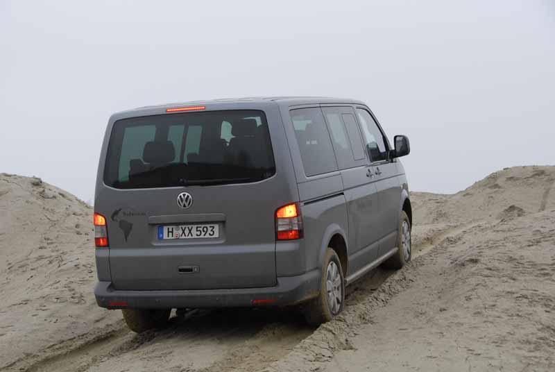 Volkswagen T5 2,5 TDI PanAmericana 4motion – Lässig Globetrottern – Seite 2Weiter im Gelände: Ausgefahrene Spurrillen, dazwischen aufgeworfene Erdhügel – und das mit einem VW „Bus“? Na gut, ab Werk baut der T5 Multivan 4motion schon mal 20 mm höher als sein Pendant mit Frontantrieb. Für 11.495 Euro legt Peter Seikel noch mal 30 mm drauf – macht zusammen 25 Zentimeter Bodenfreiheit für den „PanAm“. Mit im Preis sind außerdem griffige GoodYear Wrangler AT/R der Dimension 235/70, aufgezogen auf 6 x 16 Zoll Leichtmetallfelgen im rustikalen 7-Speichen-Design. Ein Unterfahrschutz vorne (für Ölwanne und Getriebebox) rundet das Package ab, mit dem der T5 zum Globetrotter-Bus fürs Grobe wird, der hier so manchem martialischer daher kommenden SUV den Schneid nimmt. Nächste Session: Sand. Auch hier zeigt der PanAmericana sich gerüstet, kommt mit seinem Drehmoment und der elektronisch geregelten Haldex-Kupplung auf und über die leichte Düne. Der Wall vor dem Anstieg ist dank der 37 Grad Böschungswinkel kein Problem, der glatte Alu-Unterfahrschutz schiebt da ein wenig Sand vor sich her. Dass der Bauch beim Abwärtsweg leicht über den Untergrund schabt, verwundert aufgrund des langen Radstandes nicht weiter – obwohl der T5 mit 18 Grad einen besseren Rampenwinkel aufweisen kann als so manches Kompakt-SUV. Gleiches gilt für den hinteren Böschungswinkel: Da zeigt sich der T5 4motion PanAmericana dank Seikel-Fahrwerk mit 26 Grad talentierter als beispielsweise BMW X3 (22°), Audi Q5 oder Mercedes GLK (jeweils 25°). In puncto Platz- und Komfortangebot übertrifft er Sport Utility Vehicle wie diese in seiner Eigenschaft als Bus ohnehin: Im „PanAm“ dürfen sich die vier Passagiere im Fond auf bequemen, lederbezogenen Einzelsitzen mit Armlehnen räkeln. Die beiden Sessel in der zweiten Reihe lassen sich nicht nur längs verschieben, sondern auch drehen – wir kennen das vom „normalen“ Multivan.
