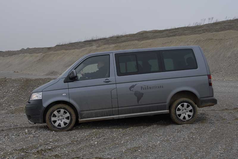 Volkswagen T5 2,5 TDI PanAmericana 4motion – Lässig Globetrottern – Seite 3Noch ein kurzer Ausflug in die Verschränkungspassage, wo die schraubengefederte Einzelradaufhängung des T5 gar keine so schlechte Figur macht. Lediglich die Wasserdurchfahrt meiden wir: Hier ist bei bereits bei einem 35 Zentimeter hohen Pegel Schluss. Zurück auf die Straße: Hier legt das alte Pumpe-Düse-Aggregat seine kraftvolle Souveranität ab, will aufgrund des schmalen nutzbaren Drehzahlbandes zwischen 1.500 und 3.500 Touren letztlich fleißig geschaltet werden. Das fällt gottlob nicht schwer: Die VW-Techniker haben dem kleinen Kraftfenster mit einem gut abgestuften und über den Joystick kurzwegig schaltbaren Sechsgang-Getriebe Rechnung getragen. Die finale Zahnradpaarung ist ausreichend lang, um selbst den 2,04 Meter hohen und immerhin 2460 Kilo schweren PanAmericana auf über 180 km/h zu treiben und ihn auf einen für diese Größe moderaten Verbrauch von knapp über 10 Liter zu beschränken. Wer die Kraftreserven des Fünfzylinder-Reihenmotors auf der Straße nicht ausreizt, kann den Aktionsradius des 80 Liter-Tanks auch noch ausweiten. Gut gerüstet für die panamerikanische Version des „Long way down“, also!? Die beiden schauspielernden Motorradfahrer Charley Boorman und Ewan McGregor waren noch nicht auf dem Pan-American-Highway unterwegs. Sie haben in dieser Richtung – von Nord nach Süd – zunächst einmal Europa und Afrika durchquert. Würden Sie nun die amerikanischen Kontinente befahren wollen, wären sie mit dem VW T5 PanAmericana als Begleit- und Transportfahrzeug gut beraten. Zumindest für Teilstücke, auf denen die Reise mit den Motorrädern beschwerlich wird – denn im Laderaum des Multivan-Sondermodells ist bei ausgebauten Sitzen durchaus Platz für zwei Enduros. Und eine Motorrad-Ladeschiene inklusive Auffahrrampe, Verzurrgurten und Seilwinde bietet VW Nutzfahrzeuge ohnehin für rund 2.285 Euro an. Also hey, Charlie und Ewan: Wenn Ihr da noch einen Fahrer brauchen könnt... Ich weiß jetzt, was man mit dem VW T5 2,5 TDI Multivan PanAmericana 4motion so alles anstellen kann.