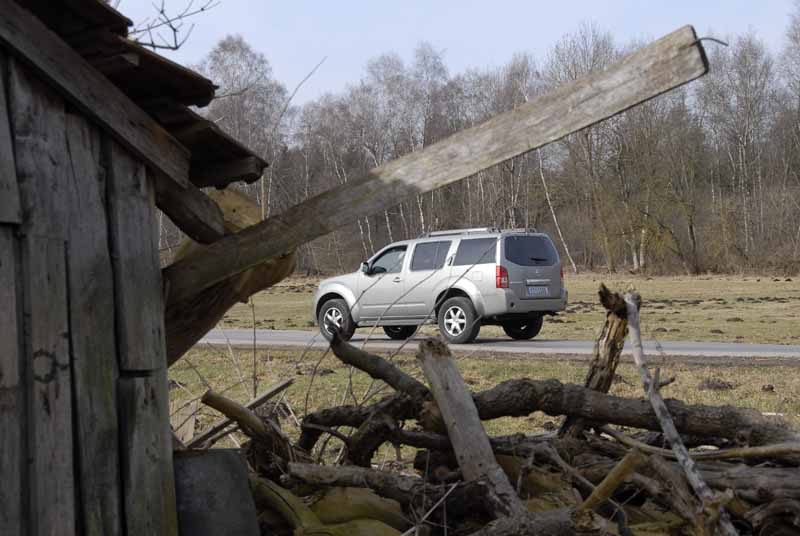 Nissan Pathfinder 2,5 dCi LE – Moderner Klassiker / Seite 3Im Ernstfall, bei Traktionsverlust an den Hinterrädern, erfolgt die Zuschaltung tatsächlich blitzschnell. Auf nasser Straße zuckt das Heck dann nur kurz und leicht beherrschbar aus, bevor sich die Fuhre wieder stabilisiert. Im Gelände zieht's den Pathfinder-Fahrer mehr oder wenige souverän aus dem Schlamassel. Dort hat er ja ebenfalls noch die Chance, per Drehschalter nicht nur die Lamellenkupplung für einen starren Durchtrieb zu sperren, sondern auch die Untersetzung elektrisch zu aktivieren. Im unwegsamen Geläuf punktet die klassische Leiterrahmen-Konstruktion mit Stabilität in der Verwindung sowie einer ordentlichen Bodenfreiheit von 23 Zentimetern und die Verschränkung liegt trotz einer Einzelradaufhängung bei tauglichen 200 Millimetern. Praktische Ergänzung im Fahrbetrieb abseits des Asphalts sind die serienmäßige Bergan- und die