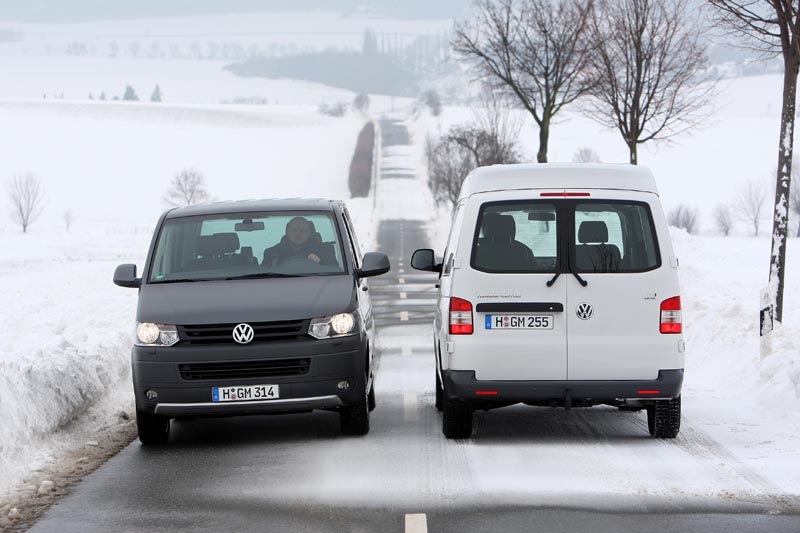 Volkswagen T5 4motion – Die sechste Generation / Seite 3Ad 3: Der Allradantrieb. Hinter der Bezeichnung „4motion“ steckt nach wie vor eine Haldex-Kupplung. Allerdings eine gegenüber dem Vorgänger gründlich modernisierte, insofern muss man auch hier von einer neuen Generation sprechen: Das Lamellenpaket im neuen T5-Allradler wird nunmehr elektronisch gesteuert, anstatt wie bisher mechanisch auf die Drehzahlunterschiede zwischen Vorder- und Hinterachse zu reagieren. Im Normalfall werden die Vorderräder angetrieben. Der Kraftfluss zu den Hinterrädern wird über den Druck in einem Ölreservoir geregelt, das von einer elektrischen Pumpe gespeist wird. Ein elektronisches Ventil sorgt für die Druckverteilung auf die Lamellen der Kupplung, die wiederum den Befehlen der Steuerelektronik folgen. Und das tun sie in diesem aktuellen Paket der schwedischen Firma Haldex fühlbar schneller als im alten System: Beim Anfahren auf eine Eisplatte reissen die Vorderräder nur kurz an, bevor die Kupplung „zumacht“ und den Kraftfluss zur Hintersachse herstellt. Wobei die Haldex-Kupplung zur Traktionsoptimierung und Erhöhung der Fahrsicherheit in rutschigem Geläuf nicht auf sich alleine gestellt ist, sondern aktive Unterstützung von der elektronischen Differenzialsperre (EDS) an der Vorderachse bekommt. Wer sich noch ein ähnliches Helferlein für die Hinterachse wünscht, kann eine mechanische Variante aus der Aufpreisliste ordern, die per Knopfdruck im Armaturenbrett aktiviert wird – ohne dann allerdings, wie noch bei der alten 4motion-Generation das ESP lahmzulegen. Reichlich Allrad-Emotion erfährt man