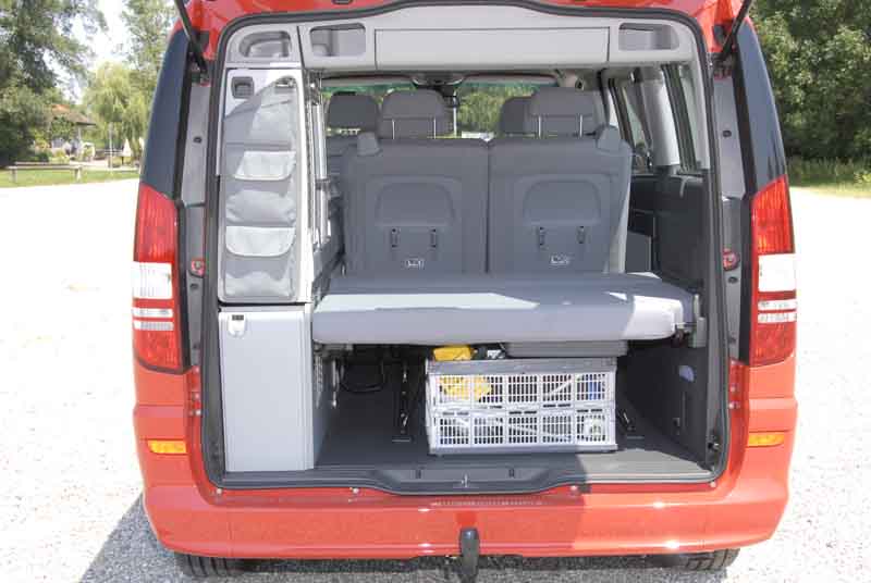 Mercedes Viano CDI 2.2 Marco Polo 4matic – Ferien auf allen Vieren / Seite 3Die nominell vier Sitz- und Schlafplätze sollten allerdings nicht dazu verführen, einen ausgedehnten Camping-Urlaub in dieser Mannschaftsstärke zu verbringen. Dafür geht's dann doch etwas eng in der kleinen Mobilhütte zu. Und auch die Staukapazitäten lassen für diese Konstellation keinen Spielraum: Weder die der Kleiderabteilchen im Heck, noch die der Wassertanks (36 und 32 Liter für Frisch-/Abwasser), der 40-Liter-Kühlbox oder der 2,8 kg-Gasflasche. In der Küchenzeile lassen auch die Größe der Unterschränke und der zweiflammige Herd sowie die Spüle keine Zweifel aufkommen, dass der Marco Polo eher die lockere Zwei- als die gedrängte Viersamkeit fördert. Angesichts einer komfortablen Sitzbank mit auf Knopfdruck pneumatisch konturierbaren Sitzpolstern und elektrisch verstellbaren Lehnen kann das Marco Polo-Duo natürlich gerne mal zwei Outdoor-Camper-Gäste für einen gemütlichen Plausch einladen. Dazu lassen sich die beiden Cockpit-Sitze drehen und der in die Schiebetüre eingeklinkte Tisch wird in der Küchenzeile eingehakt. Der Stromanschluss für die Kaffeemaschine ist leicht versteckt in der rechten Seitenwand des Küchenblocks eingelassen. Einen 12 Volt-Anschluss gibt's natürlich im Cockpit sowie in der Dachleiste oberhalb der Kühlbox. Als echter Outdoor-Campingbus hat der Marco Polo übrigens weder Toilette noch Waschraum an Bord: Für die menschlichen Bedürfnisse packt man dann eben ein porta potti oder einen Klappspaten ein. Eine Außendusche gibt's gegen Aufpreis: Der Schnell-Anschluss für den Brausekopf-Schlauch ist im Heck an der Rückwand des Gasfachs installiert – und wer will, mag ja dann ein Duschzelt an der Heckklappe einhängen.