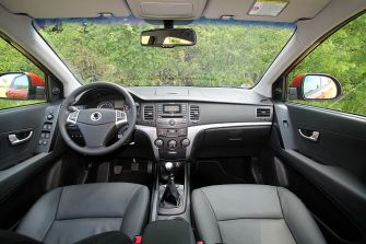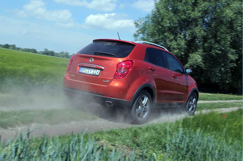 SsangYong Korando D20T AWD – Der Zwillingsdrache kehrt zurück / Seite 2Modern, übersichtlich und solide verarbeitet zeigt sich das Cockpit des Korando. Die vielen Ablagen, unter anderem in der vorderen Mittelarmlehne oder oben am Armaturenbrett, sind praktisch. Großzügig ist seine Serienausstattung: Neben den allfälligen elektrischen Helfern glänzt der Koreaner bereits in der 24.490 Euro teuren Allrad-Basisausstattung „Quartz“ mit Oberklasse-Features wie Sitzheizung, automatisch abblendendem Innenspiegel, Einparkhilfe hinten, Alarmanlage, Tempomat und einer Lenkrad-Fernbedienung für die Stereoanlage mit Bluetooth- und USB-Schnittstelle. Dass die Sicherheitsausstattung ebenso komplett ist, versteht sich da fast schon von selbst. Zunächst kommt als einzige Antriebsquelle im Korando ein zwei Liter großer Commonrail-Turbodiesel mit 129 kW/175 PS bei 4.000 U/min zum Einsatz. Das maximale Drehmoment von 360 Nm des Xdi200 genannten Triebwerks liegt zwischen 2.000 und 3.000 Touren an, und sein Verbrauch soll bei 6,4 Liter liegen, was CO-2-Emissionen von 169 Gramm pro Kilometer entspricht. Sobald sich die Nadel des Drehzahlmessers der Zweitausender-Markierung nähert, legt der Vierzylinder richtig los, bis er jenseits von 4.000 Touren wieder an Drehfreude verliert. Im schmalen Drehzahlband zwischen zwei- und viertausend Kurbelwellenumdrehungen macht das Triebwerk aus koreanischer Produktion richtig Spaß, darunter wirkt er schlapp, darüber wird er zäh.