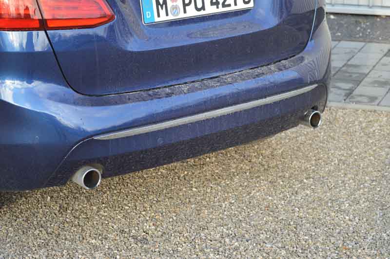 BMW Active Tourer 225i xDrive – Ich bin zwei Autos / Seite 3Der Allradantrieb wirkt permanent auf beide Achsen, wobei für die bedarfsweise Kraftverteilung eine elektronisch geregelte Lamellenkupplung zuständig ist. Grundsätzlich ist das System hinterachsbetont, was der Fahrdynamik zuspielt und den in unserem Falle knapp 1,6 Tonnen schweren Active Tourer mit leichtem Heck-Sidestep in schnelle Kurven hineinzirkeln lässt. Und sobald der Drang des Hinterteils zum äußeren Kurvenrand grenzwertig scheint, bremst die System-Elektronik von xDrive und Fahrassistenten das Temperament ein und die BMW-Niere im Kühler folgt brav dem Lenkradeinschlag. Keine Panik, alles easy für Fahrer und Besatzung, die sich jeweils in gut seitenführenden Sitzmulden kommod-sicher aufgehoben fühlen. Übrigens kann der Chauffeur das Regelsystem via des so genannten „Fahr-Erlebnis-Schalters“ ganz nach Tagesform und Laune einstellen: Auf Eco Pro-, Normal- oder Sportmodus. Sprich: Er hat die Wahl zwischen familienbudgetbewußt Sparen, alltagskonform dahinschraddeln oder ziemlich viel Freude am Fahren haben. Wobei zu Letzterem auch das Sounddesign der 225i-Auspuffanlage animiert: Fenster auf und dann das von der Tunnelwand retourfauchende Echo genießen. Lassen wir uns da von 9,8 Liter Super auf 100 km einbremsen? Mitnichten. Das andere Extrem macht aber auch Laune, vor allem dem Spritpreisbewußtsein: 7,7 Liter im Eco-Modus, da scheint in der Anzeige für die Reichweitenerhöhung schon mal eine zweistellige Ziffer hinter dem „Plus“ auf – obwohl wir immer noch recht zügig unterwegs sind. Also ja: Der BMW Active Tourer 225i xDrive ist tatsächlich zwei Autos in einem. Wir delektieren uns vor allem an den beiden unterschiedlichen Fahrcharakteren sportlich-aktiv und tourig-sparsam. Sein Allroundtalent als sportlich-brauchbare Familien-„Kutsche“ kann er mit den Kombi-Genen des ladefreundlichen Fonds ausspielen. Entspanntes Aktivtouren erlauben die recht umfangreichen Serienfeatures des Basispakets Advantage, zu denen unter anderem eine Auffahrwarnung mit City-Anbremsfunktion, Regensensor mit Fahrlichtsteuerung, ein Multifunktions-Lenkrad (mit den vielen wahlintensiven Selbstbedienungstasten), Parksensoren in der Heckstoßstange oder ein Tempomat mit Bremsfunktion sowie eine Freisprecheinrichtung inkl. Audiostreaming via Bluetooth zählen.