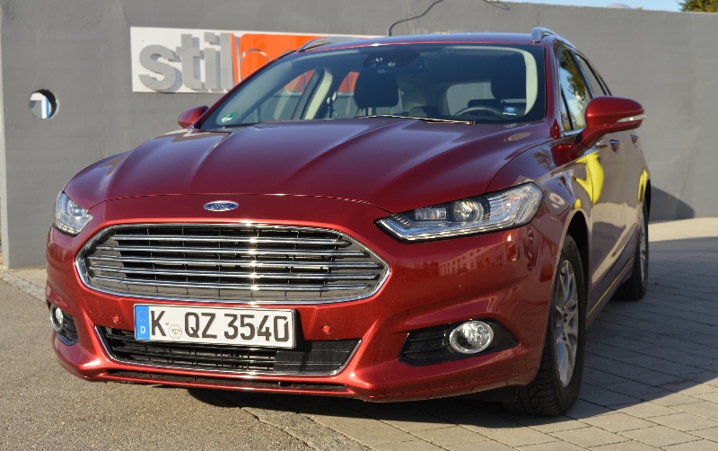 Ford Mondeo Titanium Turnier 2.0 TDCi AWD – Perfect Understatement15.04.2016 Irgendwie guckt er ja ein wenig böse und aggressiv aus seinen schmalen Schweinwerferaugen. Wirkt damit auf den ersten Blick mit seinem Breitmaulgrill fast ein bisschen wie jene britische Raubkatze, deren Markenlogo einst zum Ford-Konzern gehörte. Dennoch scheucht die Mondeo-Front mit den dem variablen Kühlerlufteinlass den Vorfahrer auf der linken Spur nicht fluchtartig nach rechts. Na gut, dann lehnen wir uns jetzt einfach entspannt in den Fahrersitz zurück und warten gelassen darauf, den 180 Dieselpferden erneut die Allradantriebs-Sporen geben zu können, sobald die Asphaltbahn vor uns wieder frei ist. Eben noch sportlich schnell, jetzt komfortabel cruisend. Unterwegs im Ford Mondeo Titanium Turnier 2.0 TDCi AWD. Wir waren auf der Suche nach dem perfekten Allrad-Reise-Kombi. Und das mit knapp 50.000 Euro Budget. Ob wir da fündig wurden, fragen Sie? Ein Blick in das Angebot von Ford Deutschland weckte preis-/leistungsverlockende Begehrlichkeiten in Gestalt dieser vielversprechend komplett ausgestatteten Mondeo-Version: mit dem Titanium-Paket, dem 180 PS starken Zweiliter-Common-Rail-Turbodiesel in Kombination mit der „PowerShift“ genannten 6-Gang-Automatik und einem permanenten Allradantrieb mit variabler Kraftverteilung. Der Händler ruft dafür aktuell 48.250 Euro inklusive Mehrwertsteuer auf. Wie fair und fahrspaßintensiv ist dieses Angebot? Erste Antwort: Fair in puncto Sitzplatz- und Gepäckraum-Angebot. Auf fast 4,87 Meter vom vorderen Stoßfänger bis zur Heckklappe verteilen sich der quer eingebaute Vierzylinder-Turbodiesel, zwei ergonomische Sitze vorne, eine lobenswert beinfreiheitliche Bank hinten sowie mindestens 488 Liter Volumen für das Gepäck von idealerweise vier Personen. Fahrer und Beifahrer bewegen sich beim Einsteigen auf Kollisionskurs mit der aerodynamisch angeschrägten A-Säule. Aber einmal unbeschadet drin im Vordersitz, fühlt man sich wohl.