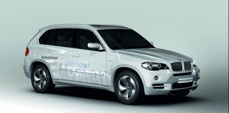 X5 mit Hybridantrieb – Weltpremiere in Genf22.02.2008 Auf dem Genfer Automobilsalon präsentiert BMW die Konzeptstudie „Vision EfficientDynamics“ - ein Diesel-Hybridfahrzeug auf Basis des X5. Der „BMW Vision EfficientDynamics“ ist eine Studie auf Basis des X5, bei der ein Dieselmotor und die ActiveHybrid Technologie kombiniert werden. Heraus kommt eine Gesamtleistung von 165 kW, die dem Hybrid-X5 eine Beschleunigung von null auf 100 km/h in 8,9 Sekunden ermöglicht. Gleichzeitig pendelt sich der Verbrauch auf 6,5 Liter je 100 Kilometer im EU-Testzyklus ein, der CO2-Ausstoß liegt bei 172 Gramm pro Kilometer. Unter der Haube der Konzeptstudie sorgt ein 2,0 Liter großer Vierzylinder-Diesel mit Variable Twin Turbo und Common-Rail-Direkteinspritzung der dritten Generation für Vortrieb. Der Selbstzünder leistet 150 kW/204 PS und entwickelt ab 2.000 Touren ein maximales Drehmoment von 400 Newtonmetern. Unterstützt wird der Diesel von einem in das Getriebegehäuse integrierten Elektromotor mit einer Leistung von 15 kW und einem maximalen Drehmoment von 210 Newtonmetern.
