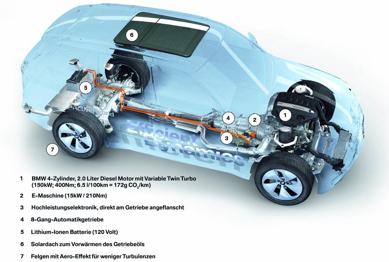 X5 mit Hybridantrieb – Weltpremiere in Genf - Seite 2Die E-Maschine sorgt darüber hinaus im Verbund mit einem Lithium-Ionen-Akku im Heck des Fahrzeugs für die Versorgung zahlreicher elektrischer Verbraucher mit Strom. Durch das Mild-Hybrid-Konzept gewinnt das Fahrzeug bei der Beschleunigung unmittelbar an Dynamik: Die Gesamtleistung beider Motoren beträgt 165 kW. Zusätzlich kann die E-Maschine im Rahmen der Bremsenergie-Rückgewinnung Strom erzeugen. Ihre Leistungsfähigkeit und die hohe Speicherkapazität des Lithium-Ionen-Akkus erlauben den elektrischen Betrieb von Nebenaggregaten in einem Umfang, der weit über das bei Serienfahrzeugen bisher gekannte Maß hinausgeht. Die Möglichkeiten dieses Konzepts reichen bis zur Versorgung des Klimakompressors, der elektrischen Kühlmittelpumpe und einer elektrischen Lenkung mit Strom. Für die erweiterten Einsatzzwecke wurde ein 120-Volt-Bordnetz konzipiert, das im Hybrid-X5 parallel zum konventionellen 12-Volt-Netz agiert. Die intensivierte Erzeugung und Nutzung von elektrischer Energie entlastet den Verbrennungsmotor, der daher verbrauchsgünstiger agiert.