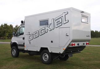 Bocklet Fahrzeugbau: Dakar 630 auf Iveco Daily – Premiere in Bad Kissingen / Seite 2Direkt hinter der Fahrerkabine angeordnet und für den Zweipersonen-Betrieb ausreichend groß sind die Sanitärzelle mit integrierter Dusche, Waschbecken und Kassetten-Toilette sowie ein Kleiderschrank. Ein großer Stauraum für das Reiseequipment findet sich direkt unter dem Heckbett, er ist von außen via einer Serviceklappe auf der rechten Kabinenseite zugänglich. Die Bordtechnik ist ganz auf Expeditionscharakter ausgelegt: Der Frischwassertank fasst üppige 230 Liter, der Abwassertank 130 Liter – beide sind frostsicher im Innenraum montiert und beheizt. Für die autarke Stromversorgung hat Bocklet der 220 Ah-Aufbaubatterie mit dem automatischen Ladegerät (12V/50A) und dem 1,2 kW-Wechselrichter eine 330 Watt-Solaranlage zur Seite gestellt. Als solide und ausreichend motorisierte Basis dient der neue Iveco Daily 4x4 (55S 18W) mit einem Radstand von 3.400 mm. Der 3,0-Liter Vierzylinder Common-Rail Turbodieselmotor leistet 130 kW / 176 PS und generiert mit 400 Nm Drehmoment ausreichend Kraft. Sie wird via einem 6-Gang-Getriebe sowie einem Verteilergetriebe mit Splitter und Geländereduktion auf alle vier Räder übertragen. Damit stehen insgesamt 24 Vorwärtsgänge und vier Rückwärtsgänge zur Verfügung. Für schweres Gelände lässt sich zusätzlich je eine Differenzialsperren an der Hinterachse (serienmäßig) sowie an der Vorderachse (Aufpreis) aktivieren. Der Basispreis für den komplett ausgesatteten Bocklet Dakar 630 liegt bei 162.500 Euro. |