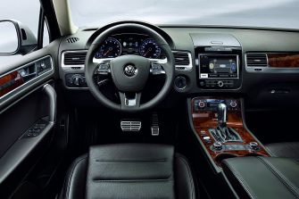 Die Parkbremse wird beim neuen Touareg auf Knopfdruck aktiviert, die V6-Versionen verfügen über ein Start-Stop-System. „Area View“ erkennt mittels vier Kameras das Umfeld des Touareg, „Lane Assist“ sorgt dafür, nicht vom rechten Weg abzukommen, während „Side Assist“ bei einem Spurwechsel vor von hinten herannahenden Fahrzeugen warnt. Die automatische Distanzregelung „ACC“ mit dem integrierten „Front Assist“ bremst schließlich notfalls bis zum Stillstand herunter und strafft vorsichtshalber schon mal die Gurte. Bi-Xenonscheinwerfer mit „Dynamic Light Assist“ sehen den Gegenverkehr und regeln das Fernlicht ohne zu blenden und der adaptive Wankausgleich sorgt letztendlich dafür, dass der Touareg sicher auf der Straße liegt.