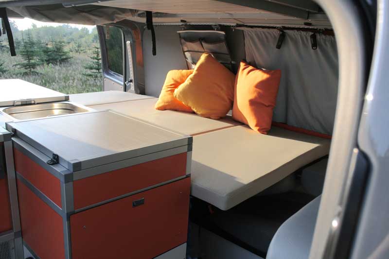 Premiere auf dem Caravan Salon 2011 in Düsseldorf: Terra Camper präsentiert Fernreise-Mobil Terock auf VW T5 Rockton / Seite 2Je nach Reisegewohnheit und Platzanspruch stehen für den Terock verschiedene Dachvarianten zur Wahl: Neben dem serienmäßigen Stahlblechdach sind dies ein aufstellbares GfK-Schlafdach, ein festes Hochdach sowie das neu entwickelte, aufstellbare Terra Camper GfK-/Aluminium-Schlafdach mit einer großen Dachluke. Es bietet eine Liegefläche von 120 x 200 cm. Klappt man den Einzelsitz im Innenraum um, steht eine zusätzliche Liegefläche von 90 x 200 cm zur Verfügung. Tagsüber kann das Dachbett platzsparend an die hintere Seite des Schlafdaches geklappt und mit Gurten gesichert werden. In Verbindung mit der Panorama-Dachluke ergibt sich im gesamten Wohnbereich volle Stehhöhe. Der Stoffbalg lässt sich mittels Reissverschluss öffnen, die Dachluke kann komplett nach hinten umgelegt werden und erlaubt damit einen Ausblick auf den nächtlichen Himmel. Auf dem speziellen Aluminium-Schienenboden lassen sich Einzelsitze mit integrierten 3-Punkt Gurten möglich. Im Gegensatz zu (schweren) Sitzbänken können die Einzelsitze ohne Schwierigkeiten von einer Person montiert und demontiert werden. Der Terock kann mit bis zu sechs Sitzplätzen ausgestattet werden. In den Seitenteilen, welche die hinteren Radkästen des VW T5 Rockton umschliessen, haben die Hagener die gesamte Technik ihres Ausbaus integriert. Je nach Kundenwunsch lassen sich darin ein 40 oder 80 Liter-Frischwassertank, eine Druckpumpe, ein Zusatzheizer, eine mit Kraftstoff betriebene Standheizung, ein Warmwasser-Boiler, ein 80 Ah Bordakku, ein Ladegerät und ein Inverter installieren.