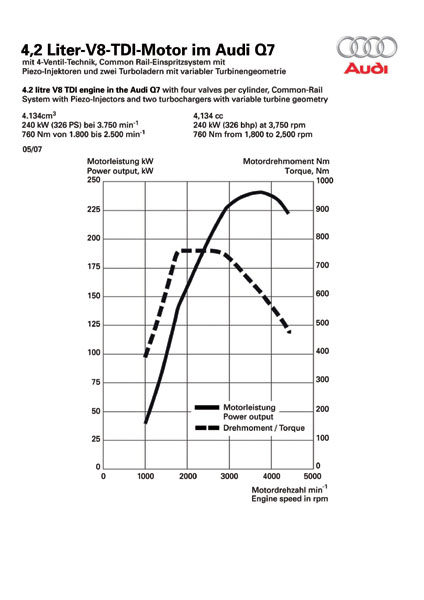 Audi Q7 4.2 TDI – Kraft und Effizienz - Seite 2Der Audi Q7 4.2 TDI überträgt seine Kraft über das sechsstufige Automatikgetriebe „tiptronic“ auf einen sportlich ausgelegten „quattro“-Antriebsstrang, der im regulären Fahrbetrieb 40 Prozent des Antriebsmomentes auf die Vorderräder und 60 Prozent auf die Hinterräder leitet. Die Luftfederung Audi „adaptive air suspension“ gehört beim Top-Diesel zur Serienausstattung.