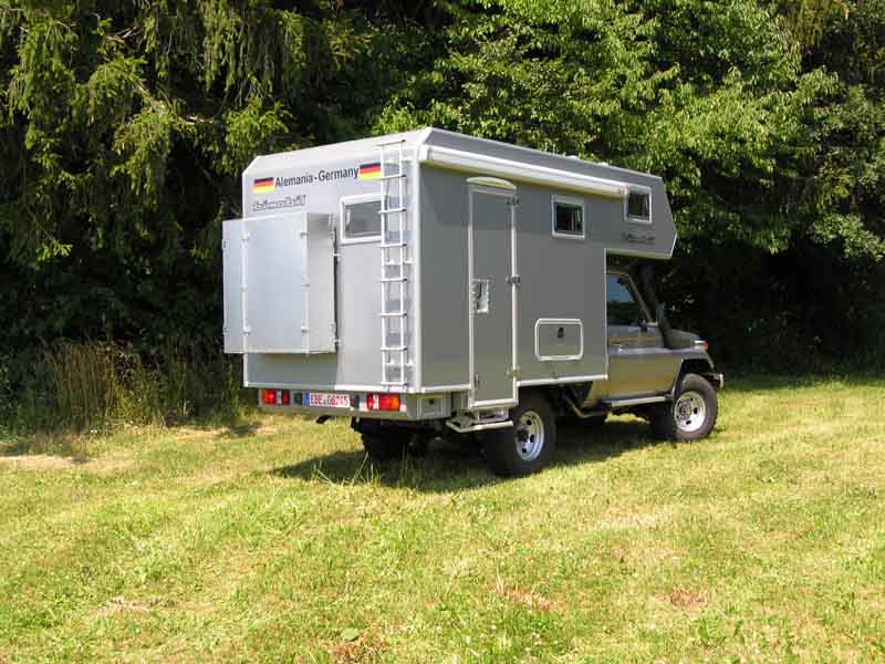 Bimobil – Das Raubein - Seite 4Bis auf diese Panels, die sich den Platz auf dem Dach mit der Klimaanlage, einem weiteren Dachlüfter und zwei Reserverädern teilen, sitzt die gesamte Technik samt 150.Liter-Frischwassertank, Wasserpumpe und Seagull-Filteranlage in den beiden Sitztruhen der Gegensitzgruppe. Ein durchgehender Stauraum darunter ist via einer Außenklappe auf der rechten Seite zugänglich. Ebenfalls durch separate Klappen von außen sind die Außendusche und die Kassette der Thetford-Toilette zu erreichen. Letztere ist mit einer Sog-Entlüftung versehen. Außen ist das silbern lackierte Mobil mit Markise, Heckleiter und einer Staukiste am Heck ausgestattet, in der nicht nur die Campingmöbel, sondern auch Zubehör wie Einspeisekabel, Wasserschlauch, Bergegurt und Schäkel mit auf Reisen gehen. Sicherheit in unsicheren Regionen soll das Treibstangen-Sicherheitsschloß in der Eingangstüre bieten, in der Leuchte darüber ist ein Bewegungsmelder installiert und innen gibt es einen verschließbaren Durchstieg ins Fahrerhaus, um eventuell schnell und überraschend die Flucht antreten zu können.