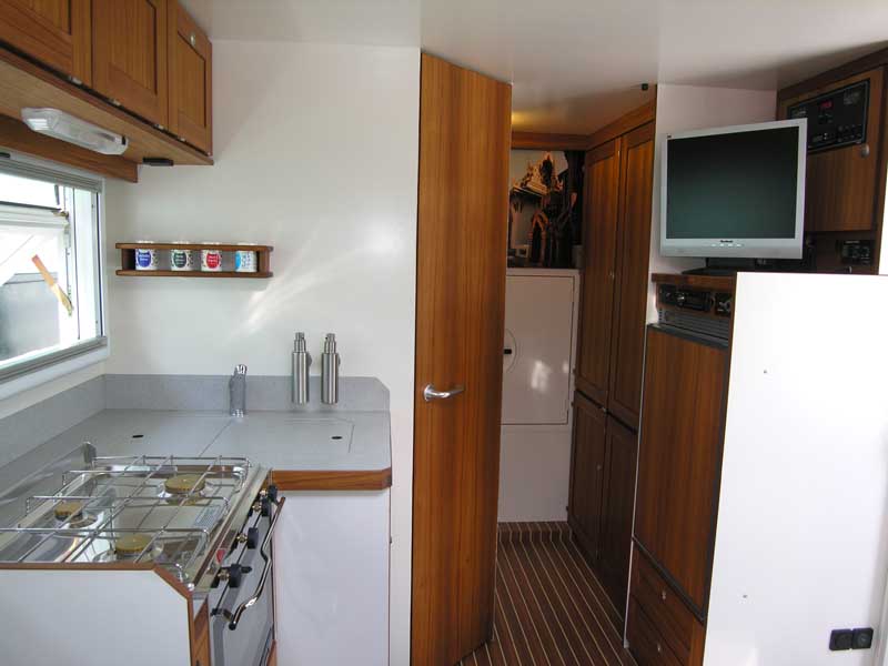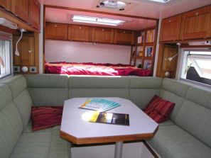 Bocklet – Der Bücherbus - Seite 2Das Heck des Dakar 720 ist im unteren Bereich um rund 30 Zentimeter eingezogen, um Platz für die beiden Reserveräder zu schaffen. Hinter ihnen lässt sich mittels eines Lifts ein Motorradträger absenken. Dank der Möbel aus 16 Millimeter dickem Sperrholz mit Teak-Oberflächen und dem typischen, gestreiften Bootsboden herrscht im Innern des Dakar 720 gediegene Yacht-Atmosphäre. Die unterstreicht auch der Grundriss, in dessen Mittelpunkt die Rundsitzgruppe steht, die sich direkt an den Einstieg anschließt. Hinter ihr liegt das Doppelbett auf dem von außen zugänglichen Heckstauraum. Für das Fußende des Schlafgemachs hat sich Michael Bocklet etwas ganz Besonderes ausgedacht: Es beherbergt auf ganzer Breite und Höhe offene Bücherregale. Unweigerlich ziehen sie die Blicke der eintretenden Besucher beim auf sich, machen den Schlafbereich zur Bibliothek.