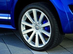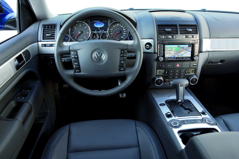 Der Touareg R50: Der V10 TDI Motor entwickelt 350 PS Leistung und 850 Newtonmeter Drehmoment - Seite 2Dem Leistungspotenzial des R50 entsprechend, konzipierte Volkswagen Individual gemäß der R-Philosophie eine neue Ex- und Interieur-Ausstattung. Von außen ist der neue Touareg R50 leicht an seinen 21-Zoll-Leichtmetallrädern des Typs Omanyt mit 295er Reifen, blau lackierten Bremssätteln, dezenten Radhausverbreiterungen, Seitenschwellern, eigenständigen Stoßfängern (Sport-Design-Paket) und einem modifizierten Kühlergrill (Chrom in einem Matt-Finish) zu erkennen. Exklusiv für den Touareg R50 gibt es die Außenfarbe „Biscay-Blue“. Blautöne dieser Art sind seit der Vorstellung des ersten Golf R32 im Jahre 2002 typisch für die leistungsstarken R-Modelle. Alternativ werden für den Touareg R50 die vier Lackierungen „Campanellaweiß“, „Reflexsilber“, „Black Magic“ und „Atacamgrau“ angeboten. Zur umfangreichen Ausstattung gehört zudem ein Luftfeder-Sportfahrwerk: Das sogenannte „Fahrdynamikpaket mit adaptivem Wankausgleich“ und zwanzig Millimeter abgesenktem Fahrwerk ergänzt dabei den Modus „Sport“ der manuell oder automatisch regulierbaren Luftfederung um eine härtere Federrate.