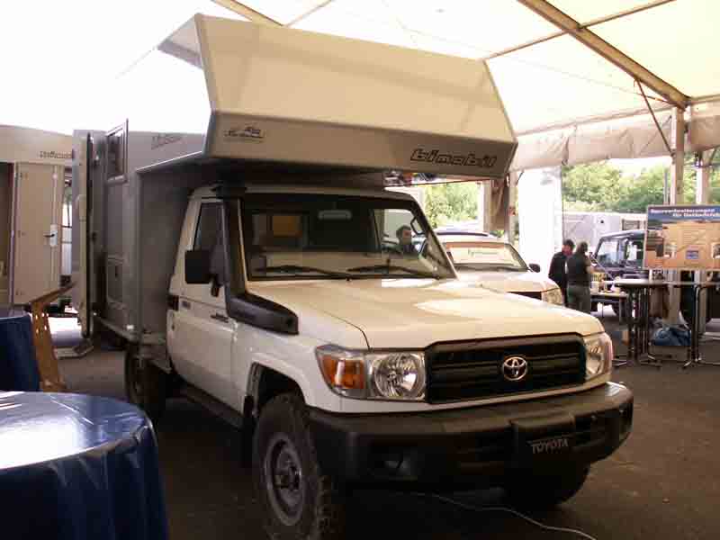 Bimobil Husky auf Toyota HZJ 79: Kabine auf solider Basis – Seite 2Reichlich Stauraum gibts unter den beiden Bänken der auf einem Podest gebauten Sitzgruppe – hier sind allerdings auch Wassertank und Bordtechnik installiert – sowie dem Kleiderschrank und den Hängeschränken. Der Toyota HZJ 79 bildet mit seinem blattgefederten Starrachsfahrwerk und dem Leiterrahmenchassis einen soliden und bekanntermaßen sehr geländegängigen Unterbau: Das 4,2-Liter Sechszylinder-Triebwerk leistet 96 kW/131 PS bei 3.800 Umdrehungen und stellt sein maximales Drehoment von 285 Nm bei 2000 Touren bereit. Der Vorderradantrieb ist konventionell über einen Hebel zuschaltbar, ebenso wie die Geländeuntersetzung (2,295:1). Der Basispreis für den Toyota Landcruiser HZJ 79 liegt bei 41.644,00 Euro, die Preisleiter für die Husky-Kabine beginnt bei 30.470,00 Euro. |