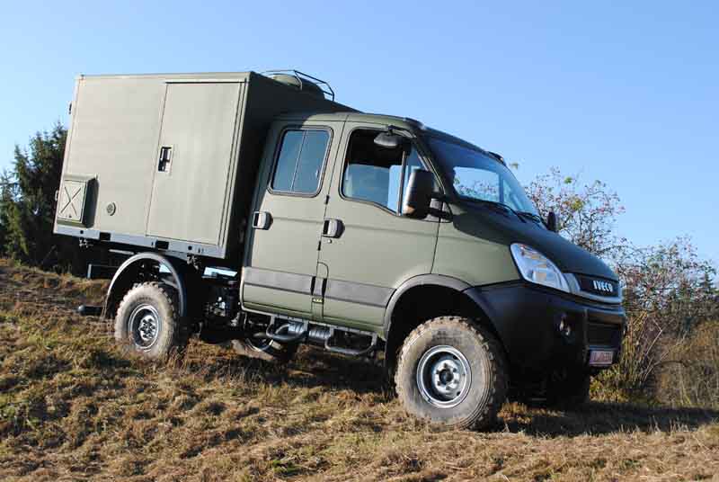 Iveco Daily 4x4 2012: Mehr Kraft auf alle Viere25.11.2011 Iveco rüstet den Daily 4x4 für 2012 kräftig auf: 205 PS und 470 Newtonmeter leistet der neue Dreiliter-Vierzylinder. Es ist ein Common-Rail-Diesel mit zwei Abgasturboladern, der hinter einer neu gestalteten Frontmaske mit größerer Kühlluft-Zufuhr installiert ist. Allerdings wird der Allradler das Facelift, im Gegensatz zu seinen heckangetriebenen Schwestermodellen, erst im Laufe des Jahres bekommen. Auch das Cockpit wurde überarbeitet, insbesondere die Schalthebelkonsole ergonomisch verbessert. Es ist im Wortsinn ein starkes Stück, das Iveco da mit der Generation 2012 des Daily 4x4 präsentiert: Die Top-Motorisierung generiert nun 205 PS (150 kW) bei 3.500 U/min und 470 Newtonmeter bei 1.400 Touren. Technisches Rüstzeug dafür sind zum einen zwei hintereinander geschaltete Abgasturbolader zur Zwangsbeatmung des Dreiliter-Vierzylinder: ein großer, der die Ansaugluft bei niederen Drehzahlen in den Verdichtungstrakt schaufelt und ein kleiner, der bei höheren Drehzahlen aktiv wird. Eine weitere Komponente für die erhöhte Leistung und Durchzugs-Kraft ist der zwischengeschaltete Ladeluftkühler („Intermediate Cooler“), der mit einem eigenen Kühlkreislauf und Ausgleichsbehälter arbeitet und die Ansaugluft für den nachgeschalteten kleinen Turbolader temperiert. Eine optimierte Abgasrückführung (EGR) mit elektrisch angesteuertem Ventil sowie ein Oxidationskatalysator mit Rußpartikelfilter (DPF) sollen die Emissionen auf die aktuelle Norm Euro 5 reduzieren. Das neue Aggregat ist mit einem ebenfalls neu entwickelten 6-Gang-Schaltgetriebe kombiniert, das ein Eingangsdrehmoment von 500 Newtonmeter verkraftet und dessen höhere Spreizung für komfortables Fahren ohne große Drehzahlsprünge und grobe Zugkraftunterbrechung sorgen soll. Der vierte Gang ist dabei nun mit 1:1 direkt übersetzt. Unverändert blieb das bewährte Permanent-Allradsystem mit einer Kraftverteilung von 35:65 zugunsten der Hinterachse und manuellen Sperren für das Mitten-, Vorder- und Hinterachsdifferenzial. Über die zentrale Transfer Box werden zwei Reduktionsgetriebe geschaltet, womit sich die Übersetzungsstufen auf insgesamt 24 Vorwärts- und vier Rückwärtsgänge addieren.