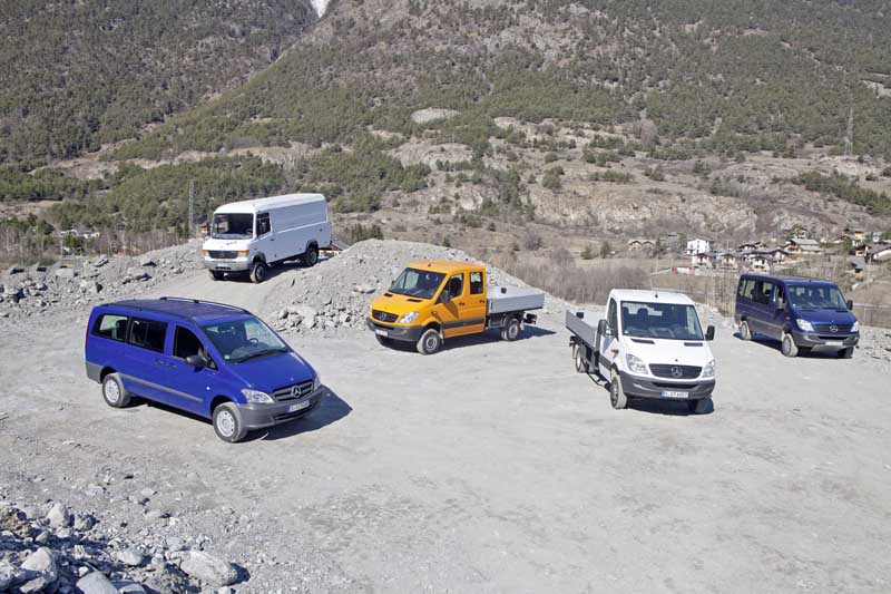 Mercedes-Benz Vans: Allrad-Offensive mit Viano, Vito, Sprinter und Vario07.04.2011 Allrad fürs Feine, Praktische und Grobe – mit den 4x4-Varianten der Baureihen Viano, Vito, Sprinter und Vario lässt die Van- und Transporter-Sparte von Mercedes-Benz ein breites Modellangebot von Multi-Purpose-Vehicle auf den Markt rollen. Der Fächer ist von der luxuriösen Großraumlimousine mit permanenten bis zum aufbauvariablen 7,5-Tonner-Leiterrahmen-Chassis mit zuschaltbarem Allradantrieb gespreizt. Die Palette der Dieselmotoren reicht vom Vierzylinder mit 95 kW (129 PS) im Vario 4x4 bis zum V6 mit 140 kW (190 PS) im Sprinter 4x4. „Nach den letzten harten Wintern verzeichnen wir deutlich höhere Bestelleingänge für unsere Allrad-Modelle,“ erläutert Nutzfahrzeugchef Volker Morhinweg die verstärkten Marketingaktivitäten in Sachen 4x4-Antriebsversionen. „Also wollen wir in diesem Sektor weiter wachsen.“ Die Vorzeichen stehen also gut und ihre Feuertaufe im Motorsport haben der Viano/Vito 4x4 und Sprinter 4x4 schon lange bestanden: In technisch nahezu serienmäßiger Ausführung setzte Mercedes-Benz sie bereits 2009 und 2010 erfolgreich bei der Rallye „Aicha des Gazelles“ in Marokko ein. In diesem Jahr konnte das Team Andrea Spielvogel und Anneke Voss mit einem Sieg in der Crossover-Klasse die Geländetalente und die Zuverlässigkeit des Vito 4x4 erneut unter Beweis stellten. Weniger rallyeambitioniert als bei der Aicha des Gazelles ging es dagegen bei der Fahrvorstellung der aktuellen Allrad-Palette zu: Um die Talente der einzelnen Vertreter der 4x4-Modellreihen anzutesten, hatte Mercedes-Benz Teile einer großen Kiesgrube präpariert. An Berauf- und in Bergabpassagen, bei einer Schrägfahrt, in einer Verschränkung, im Schlamm und bei einer Wasserdurchfahrt durften Vito 4x4, Sprinter 4x4 sowie Vario 4x4 ihre mehr oder weniger ausgeprägte Offroad-Eignung zeigen. Die Basisdaten für den Rallyeeinsatz waren durchaus vielversprechend – und sind es für den gemäßigteren Straßen- und Offroadbetrieb sowieso: In Viano 4matic und Vito 4x4 – der eine als luxuriöse Großraumlimousine, der andere als praktischer Kleinbus und Kastenwagen konzipiert – arbeiten identische Antriebsstränge und Dieselmotoren. Der Antrieb der vier Räder erfolgt via einem schrägverzahnten Verteilergetriebe, die Kraft wird in der Ausgangsverteilung zu 65 Prozent an die Hinter- sowie zu 35 Prozent an die Vorderachse. Anstatt via mechanischer Differenzialsperren wird die traktionsoptimale Umverteilung der Kraft über das elektronische System „4ETS“ geregelt, das Mercedes affine Allrad-Fans bereits aus der ML-Klasse kennen: Es ist Bestandteil des elektronischen Stabilitätsprogramms ESP und bremst jene auf einem schlupfigen Untergrund durchdrehenden Räder mit kurzen Impulsen ein. Was eben das Antriebsmoment an dem Rad (oder den Rädern) auf griffigerem Boden erhöht.