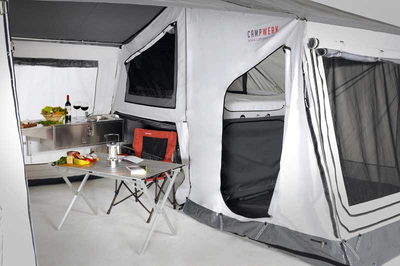 Das „Economy“ bietet unter anderem ein 210 x 175 großes Bett auf einer 10 cm dicken Schaummatratze und ist in seinen kompakten Abmessungen mit neun Quadratmetern Grundfläche auf das reisende Paar zugeschnitten. Das Paket enthält zudem ein Anbauzelt, mit dem sich der Bewegungsspielraum auf 19 qm erweitern lässt. Auf dem Anhänger zusammengefaltet beansprucht es lediglich 2,2 x 1,75 x 30 cm Packmaß. Für die Familie ist das entsprechend benannte, im Grundmaß 11 qm Faltzelt gedacht, das sich in verschiedene Räume unterteilen auf 23 Quadratmeter erweitern lässt. Die Preisliste beginnt bei 2.199 Euro.